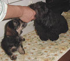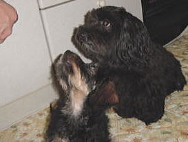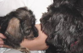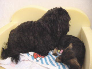 マックが小春に自分から近づいて行った 小春が顔の傍に来ても怒らない 気が付くと小さなソファに一緒にいる!やったぁ!! 家でも大丈夫かな? 小春が付きまとうとちょっとイヤそう・・・ あ〜またワンワン言われてる・・・ やっぱり家はテリトリー意識が強いのかな でも、前のような「噛む」雰囲気はないので 一歩前進だね・・・ |