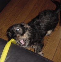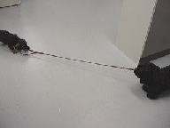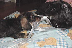 母さんに紐をもらってカミカミしてたらね、やっぱり小春が来たの〜 また取られそうになったんだけど、母さんが「こうするの」って紐の端をボクに 咥えさせてくれたの。 それでボク解ったんだ。こうしたら取られないって! 小春も引っ張ってくるから、負けないように頑張ったの 小春って小さいのにスゴイ力なんだ 母さんは「マック負けるな〜」って応援してくれたよ |