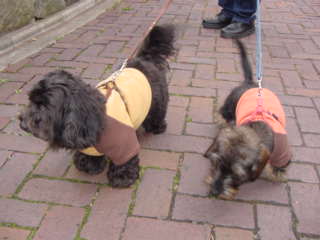 大きな箱がお家に届いたの。 何かなっと思って覗いてみたらキレイな色の布が入ってたよ 母さんは「マックちゃんと小春の〜」って言ってたけど、ただの大きな布なの いったい何が出来るのかな? ボク、ちょっと恐ろしいの。母さんは張りきって作ってくれるけどね。 何が恐ろしいかは写真で分かると思うよ 動く度にずりあがって「かみしも」みたいになるの 母さんは「あはは〜殿中でござる〜。でも、討ち入りは もう終わったよね〜」なんて笑ってるし・・ 「作る度にだんだん上手になるの」って 母さんは妙に前向きなんだよね・・・ |