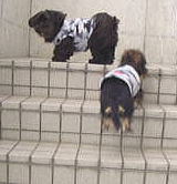 | 2月23日(土) 今日のお休みも父さんはお仕事へ行って遊んでもらえなかったの でも、母さんといっぱい遊んだよ お散歩に行ったらいつも会うゴールデン3頭つれたおばさんに会ったよ 今日はワンワン言わなかったの。 「あっ!ひとつ増えてるやん。マックの子供?」って小春のことだね 小春は大きいの3つに囲まれて母さんの足の間に隠れてたよ そのおばさんは別れ際「変ったもん好きやな〜」って、これも小春のことだよね(笑) えっ?ボクのことも入ってるの? 早く上がっておいで マック何か見える?小春何か落ちてる? |