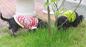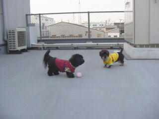 | 4月10日(水) 3時のコーヒータイムが終わったら急に「お外出ようか〜」って ボクと小春がドアのほうへ行こうとしたら「こっち」って、おニ階のお外の事だったの 小春とあちこちクンクンしたり走ったりしてる間、母さんはフェンスの傍で何かお仕事してたの 網が珍しくってゴロンゴンしたり、堀り掘りしたりしてたら「もう〜邪魔ばっかりして〜」って 叱られたの。でも、ちょっと見えなくなると、すぐ「マック〜小春〜」って呼び戻すんだから 「今日はここまで」って、後は一緒に追いかけっこしたよ でも、母さんはすぐ休憩するんだから。ちょっと運動不足なんじゃないかな〜 ![]() フェンスの下が少し開いていて見ていないと怖かったのでガーデニング用のネットをはってみた。これで忙しくて一緒に遊べない時もお外に出してあげられる。気分転換になってくれるといいのだけど ![]() 性格の違いがはっきり(笑) 「投げて」とお行儀良く待つマック対「ほってぇ〜」とただをこねる小春 |