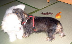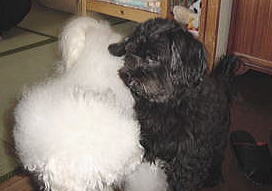 | 5月21日(火) 会社の近くに飯場のおじちゃん達の寮があるの おじちゃん達はあたちとマック兄たんを見ると、とってもやさしいお顔で話し掛けてくれるの 今日初めて会ったおじちゃんは、あたちを見て 「べっぴんさんやな〜」って言ってくれたわ なんて見る目があるおじちゃんなのかちら♪ でも、母たんは「変った人もいるもんや〜」だって 失礼しちゃう。プンプン |
