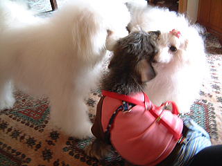 | 母さんのネットのお友達、コップママんちの姉タンが埼玉から遊びに来てくれたの 母たんはお昼からお休みをして会いに行ったの 行きの車の中ではいつも気をもんでる兄たんが今日は妙に落ち着いて寝てたりしてたの 「竜くんとこ行くよ」って母たんが言ってたのが分かったのかちら? コップママんちの姉タンはトリマーさんっていって、あたち達をキレイキレイしてくれる人の学校でお勉強中なんだって。 兄たん、カットしてもらったのよ〜 母たんのカットとは一味違った仕上がりでした ![]() ![]() 兄たんがカットしてもらってる間、あたちは萌たんとプロレスしたの もう、へとへとになるまで戦ったの。でも、あたち押され気味だったの あたちよりずっと小さいのに恐るべし萌怪獣でしゅ! あたちのケツケツアタックまだまだなのよっ。また教えてもらわなくっちゃ〜 ************************** ![]() 姉タンからお土産頂きました。可愛いぬいぐるみさんとバンダナ〜 いつまでお目目があるか心配だけど 姉タン、遠い所遊びに来てくれてありがとう♪。とっても楽しかったよ〜♪ |