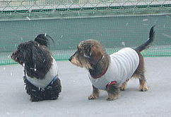 きのうの夜、すごい風が吹いてると思ったら今日は朝から雪だったよ いつもはお昼ご飯の後にお外に出るだけなんだけど、今日は何回も「出して〜」って言ったの だってね、お空から白いひらひらした冷たいものが落ちてくるんだよ ボク落ちてくる雪に飛びついたり追っかけたり、とっても楽しかったの 小春は落ちて溶けちゃった雪をペロペロしたり走ってるボクのあとを付いて走ってた 雪が楽しいっていうより、付いて走るいつものパターン 小春〜積もるともっと楽しいんだよ。でも、今年はもう無理かなぁ ![]() ![]() |