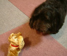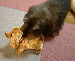 今日ボクは小春にやられたの 今までもちょくちょくやられてたけど、今日のはちょっと違ったよ 突然ガウガウされて、走って逃げたのにお尻にも首にもガウガウしながら追いかけてくるの 母さんがびっくりして大きな声で「小春止め〜」って言いながら 小春の尻尾を引っ張って引き離してくれたの ボクの悲鳴は二階にいた父さんにまで聞こえて、大急ぎで降りてきてくれたよ 小春、叱られてたけど、とっても憎たらしい顔してたから反省はしてないと思うんだ・・・ ボクの立場はいったい・・・ しばらくして「お土産〜」って変な物を出してくれたの ワンワン言いながらちまちま動くの ボクは掃除機に挑む時と同じようにワンワン言ったけど 小春は怖くて鼻でツンツンしてた こんな物が怖いくせに、何故ボクには強いの? ![]() ![]() |