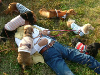 | 歩いても歩いても売れぬワンコにとうとう力尽き・・倒れる 心配して群がるワンコ達 駆け寄る後輩ワンコ売り |