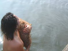 | 堤防からカカさんの胸に飛び込むベジータくん。結構高かったんだよ〜すごいね! | |