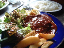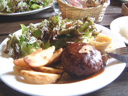 | タンシチュー(左)。運転手さんにはりこみました☆ハンバーグ〜(右) ミンチ系がダメなパパのせいで我家の食卓にミンチ料理は並びません 外での食事はミンチ補給のママです。ハンバーグちゃん、おひさしい〜(爆) |